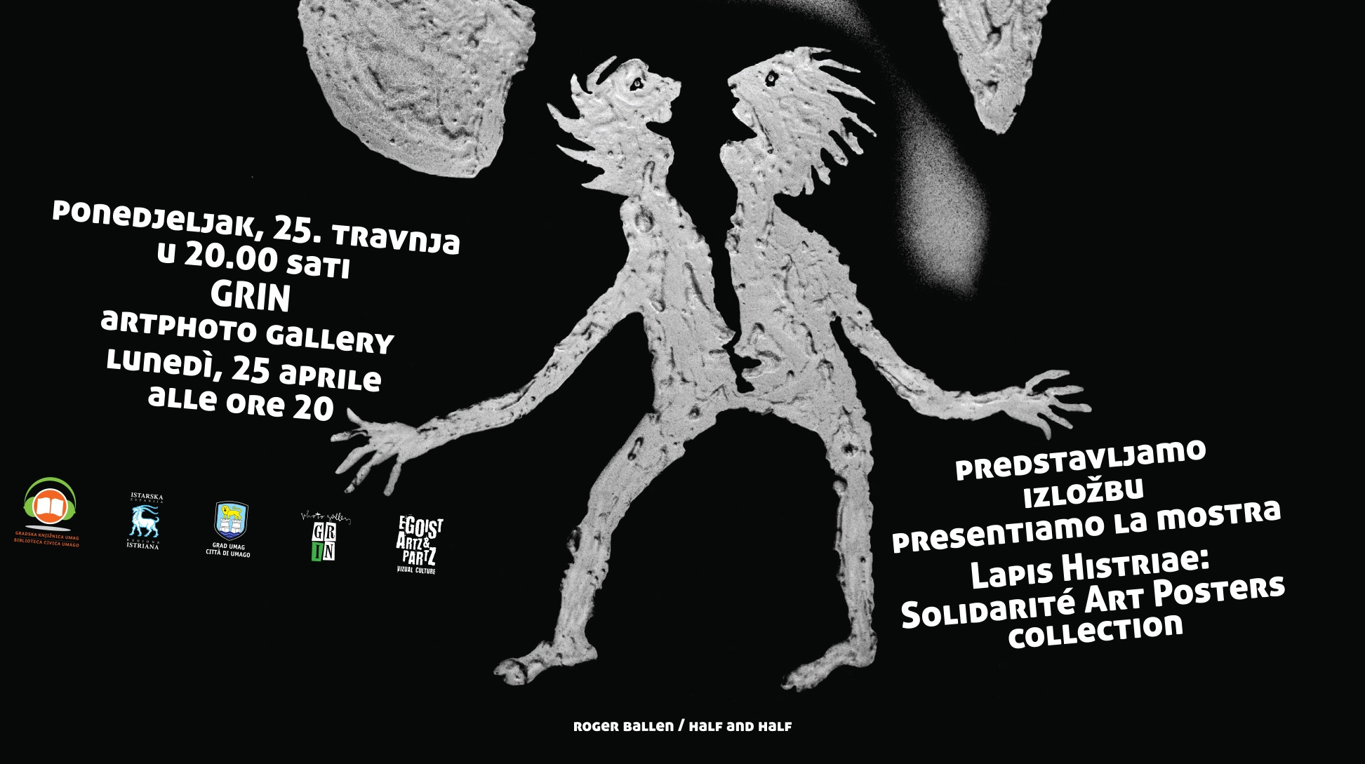 U okviru manifestacije Noć knjige (ove godine program traje od 22. do 25. 4.) u ponedjeljak 25. 4. 2022. godine u 20:00 sati predstavljamo izložbu Lapis Histriae: Solidarité Art Posters collection u Grin Photo Gallery (Poljane 9). Kuratorica izložbe je Maja Briski. Ravnatelj Gradske knjižnice Umag Neven Ušumović najavit će program ovogodišnjeg Foruma Tomizza koji će se pod motom "Kaoskairos" odvijati od 17. do 21. 5. u Trstu, Kopru i Umagu i na kome će biti proglašen novi dobitnik nagrade književnog natječaja Lapis Histriae. Dobrodošli!